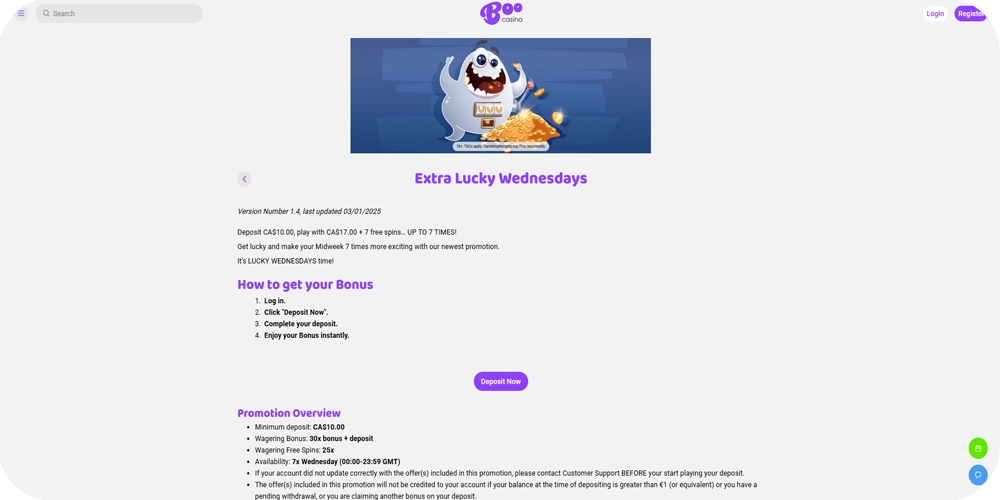 Every Wednesday, Boo Casino players get the chance to claim a special Extra Lucky Wednesdays bonus. Simply deposit CA$10 to get CA$17 and 7 free spins to make your midweek gaming session even more exciting. This promotion is a great way to spice up your weekly routine and give yourself extra chances to win. As a player at Boo Casino Canada, you can enjoy this exclusive offer each week. Don’t miss out on the fun and take advantage of this exclusive weekly offer!
